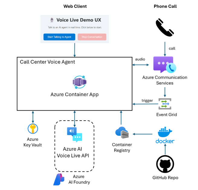 - Azure Voice Live API – Provides the speech-to-speech engine combining ASR (Automatic Speech Recognition), LLM, and TTS (Text-to-Speech) in a unified interface