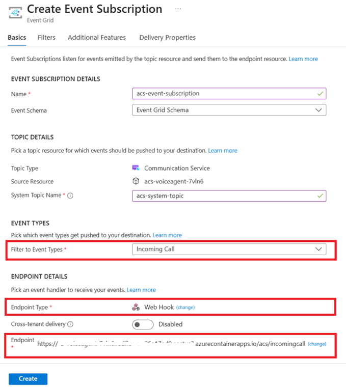 To receive incoming calls, we configured an Azure Event Grid subscription: